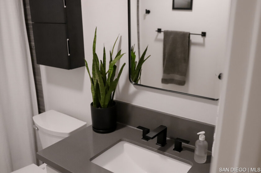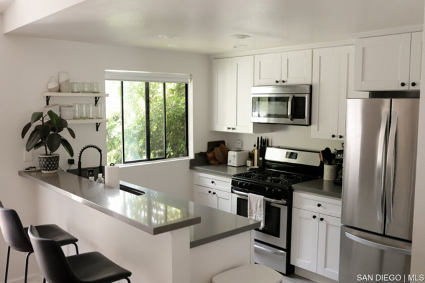 This upper unit of the Casa Frontera Community, in the heart of North Park, offers a bright and highly updated feel. The unit comes with a one car garage & covered parking spot for convenient parking, and PRIVATE washer & dryer!! No other unit in the complex has its own washer & dryer. Upon entry, via a smart lock, you will be met with an open floor plan offering wood laminate flooring, vaulted ceilings, and an updated kitchen. The kitchen has been updated with white cabinetry, quartz countertops, stainless steel cooking appliances, recessed lighting, updated hardware, floating shelves, and fresh paint. Open the living room balcony doors to let cool breezes flow throughout the home all year long. The bathroom has been updated with white flooring, matte black hardware, new showerhead with water filter, new toilet, updated plumbing, and new floating cabinetry. Other upgrades include new ceiling fans in the living room & bedroom, new through-wall A/C unit, & updated electrical panel in the closet. Along with all the upgrades comes the convenience of living in North Park! You will be within walking distance to University Ave. where the latest nightlife and dining are located. All necessary shopping conveniences such as grocery stores, Target, CVS, and fitness gyms are also within walking distance to this location. If you are a pet owner, there are pet friendly coffee shops and a dog park located very close by as well!! Get the very best North Park has to offer and more, do not miss this opportunity to own one of the most updated units on the market!
