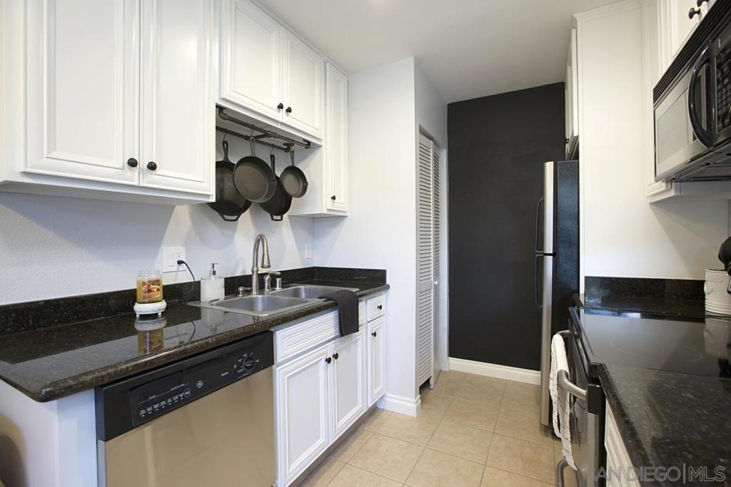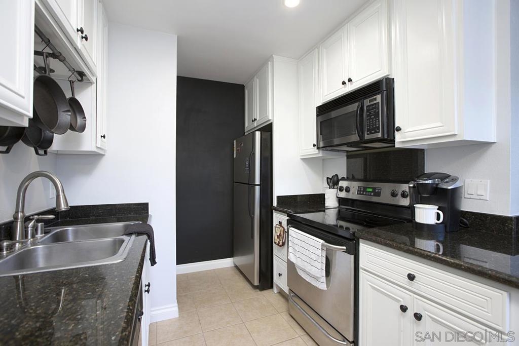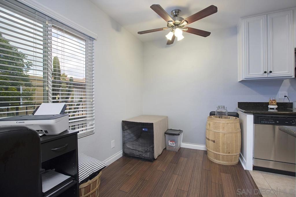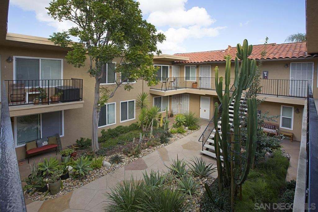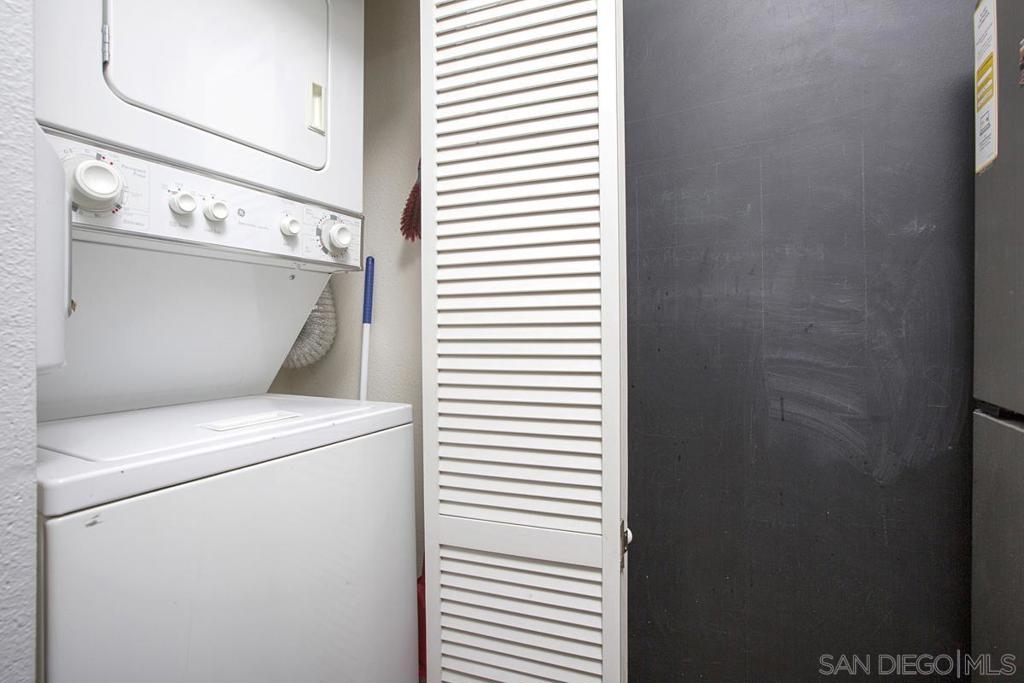 Upstairs condo that overlooks the community courtyard. Galley kitchen, granite slab countertops, built-in microwave, stainless appliances, in unit stacked laundry. Dining area opens to the kitchen and living room and includes a ceiling fan. Bright primary bedroom features mirrored closet doors and offers private access to the bathroom. There are 2 assigned outdoor parking spaces off the rear alley.