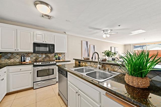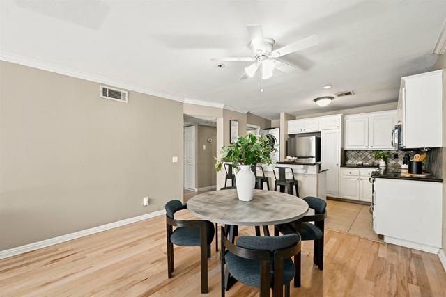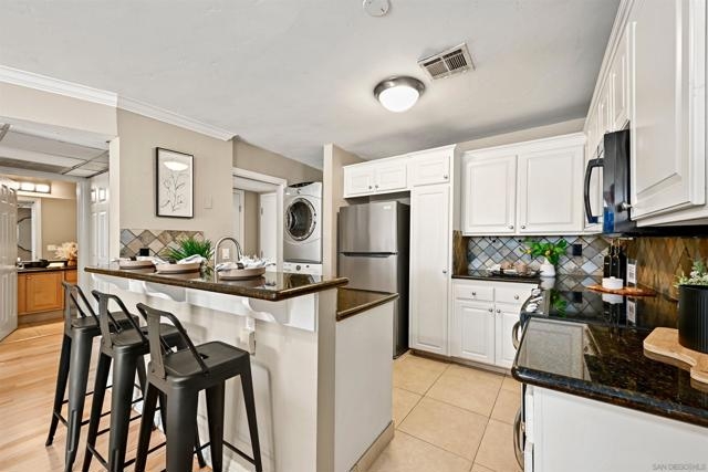 Beautiful Sunset Villas ground-floor condominium located in the vibrant heart of North Park, just down the street from popular restaurants, boutiques, coffee shops, pubs, and the weekly farmer’s market. This secure, gated community welcomes you into an open-concept living space featuring refinished hardwood floors and crown molding. The spacious living room opens to an expansive private patio—ideal for entertaining, dining al fresco, or simply relaxing. The layout also includes a dining area and a well-appointed kitchen with white cabinetry, granite countertops, slate backsplash, stainless steel appliances, and bar seating. A convenient stackable in-unit washer/dryer is included. The grand primary suite offers both a walk-in closet and an additional closet, along with a full bathroom and a half bathroom featuring maple cabinetry and granite countertops. One assigned parking space is also included. Set in one of San Diego’s most desirable neighborhoods, this move-in ready home offers the perfect blend of comfort, style, and urban convenience. Welcome home!
