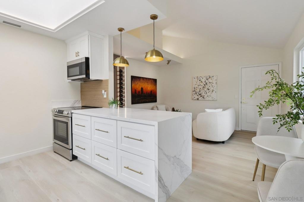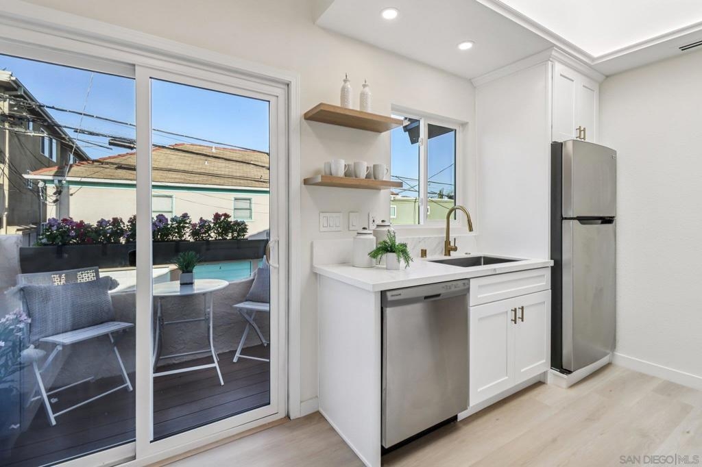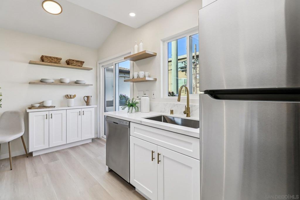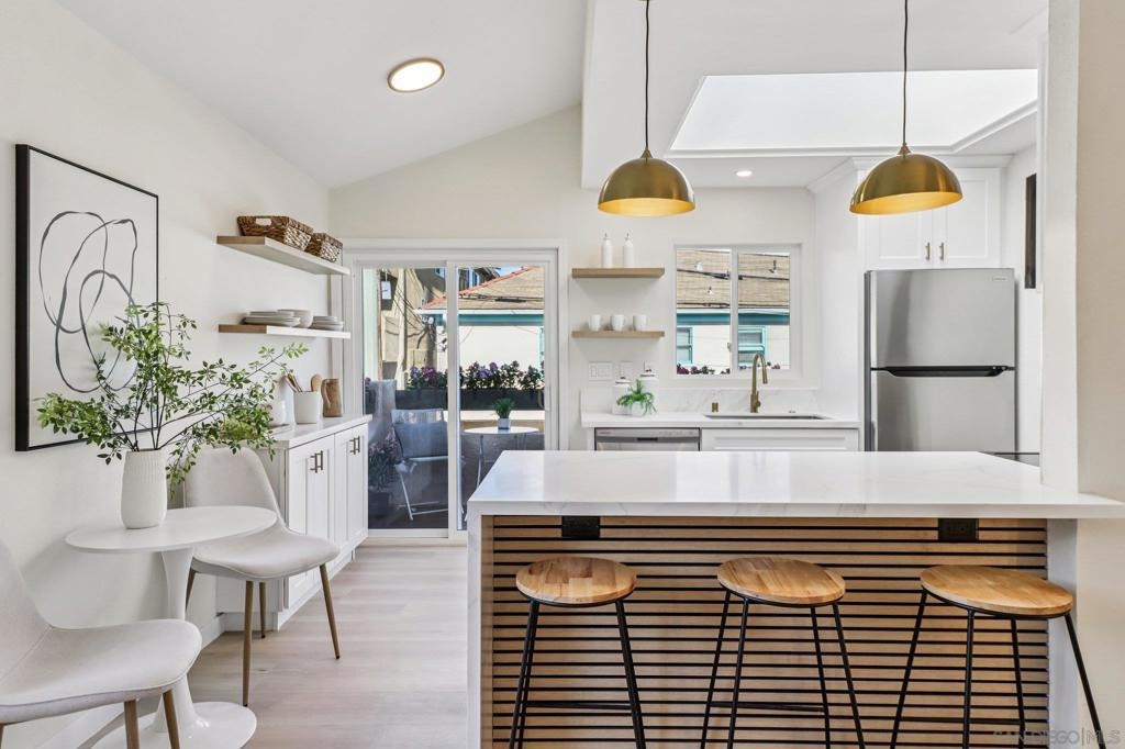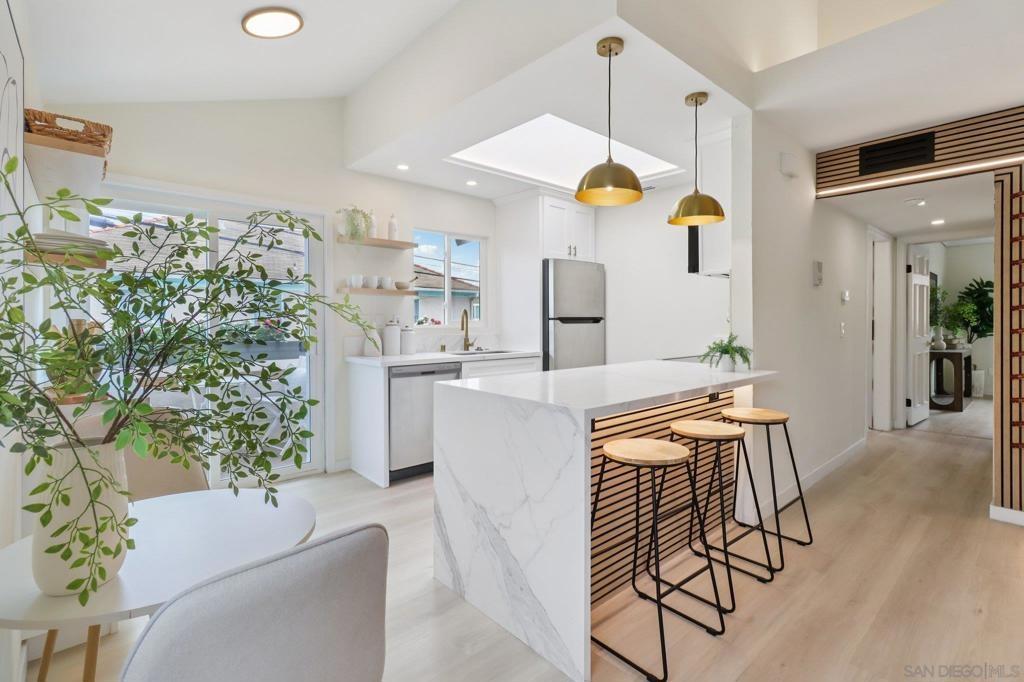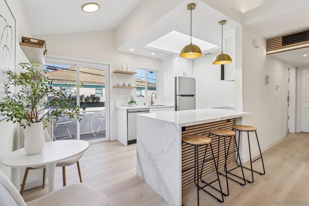 Top-Floor 2B|2BA North Park Stunner | Private Patio • Skylight • Garage + Parking Welcome to 4043 Utah St #8 — a bright, top-level end unit privately situated at the back of the complex with no neighbors on 3 sides or above. Bathed in natural light from multiple exposures and a skylight, this North Park condo lives like a peaceful retreat in the heart of the city. Inside, enjoy new luxury LVP flooring, a cozy fireplace, and a seamless open floor plan that connects the living area to your own oversized private patio with decking—accessible from both the kitchen and the primary bedroom suite. This rare outdoor space is perfect for lounging, entertaining, gardening, or enjoying warm San Diego evenings. The kitchen has been tastefully updated with waterfall-edge countertops, sleek cabinetry, and modern appliances. Full hvac unit ensuring comfort all year round, while in-unit laundry adds everyday ease. The primary suite is spacious and tranquil, enhanced by soft natural light and direct patio access. The bathroom and layout offer functional flow with plenty of storage. Outside, you’ll enjoy an attached garage with rear gate access, plus a second reserved parking space directly in front of the garage—a coveted bonus in North Park.