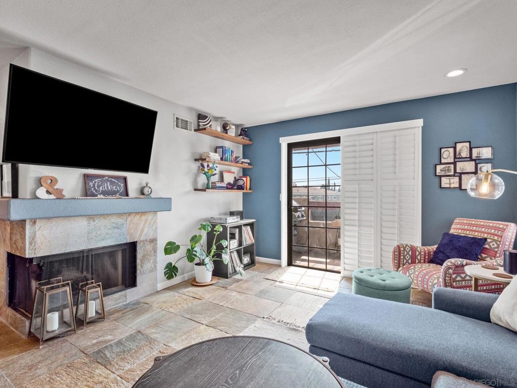Experience life in the heart of North Park at Utah Park II, a community of sixteen privately owned residences within walking distance of shops, restaurants, breweries, coffee shops, the North Park Observatory, Target, and more! This two-bedroom, one-bathroom, top floor corner unit is in a prime location within the community, with only one shared neighboring wall. Enjoy off-street parking with a dedicated one-car garage with space for storage, a Genie garage door opener with keypad entry, and an additional parking space in front of the garage. The kitchen features dark wood cabinetry, stainless steel appliances, under-cabinet lighting, granite countertops, a garden window, and a peninsula with room for barstool seating. The dining area features a modern light fixture and a built-in bar, complete with wine storage. The sliding glass door in the main living area leads to your private deck, perfect for BBQing, or enjoying sunsets. The great room has an open airy feel, featuring a wood-burning fireplace in the center of the room, perfect for cozying up on those cooler San Diego nights. The bathroom has a dark wood vanity with granite countertop, a tile surround shower/tub combo with recessed shelf and sliding glass enclosure. Laundry has never been more convenient, with full size in-unit Kenmore washer and dryer located in a hallway closet. Enjoy SmartHome features including a Nest thermostat for climate control of your central heating and air conditioning, and a Kwikset touchpad for keyless entry to your home. Don’t miss your opportunity to live in the heart of North Park. This secure, gated community has a shared courtyard with lush landscaping and outdoor seating, perfect for enjoying the San Diego sunshine with neighbors. Recessed lighting, tile flooring, and custom shutters can be found throughout the condo, and both bedrooms feature ceiling fans with wall mounted remote controls. Hurry this one won't last long, this property truly has it all.
