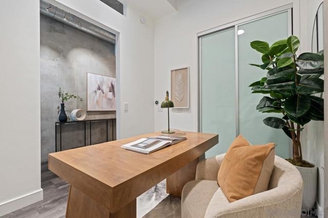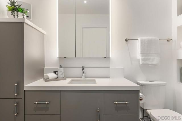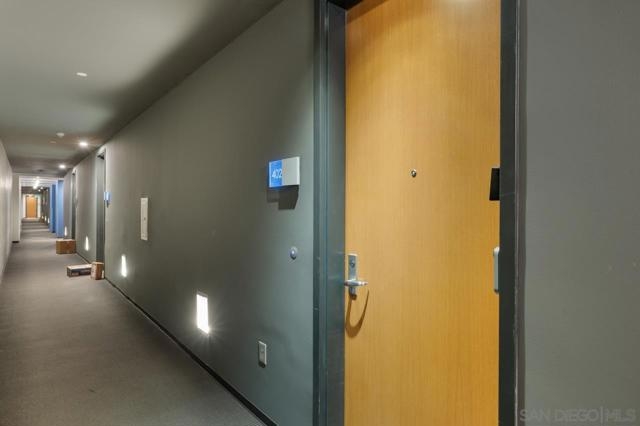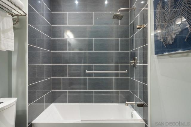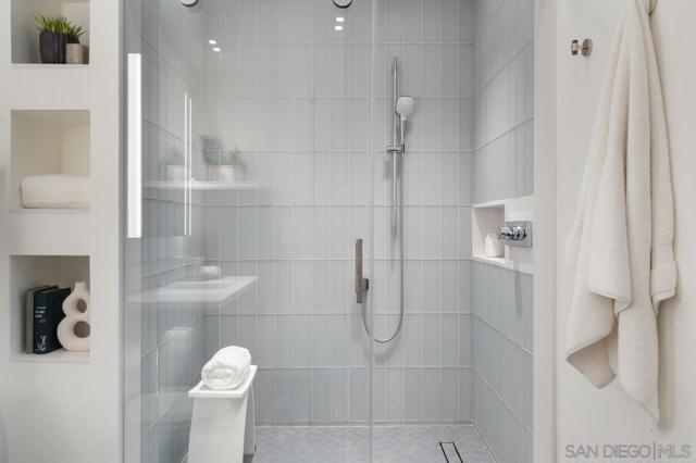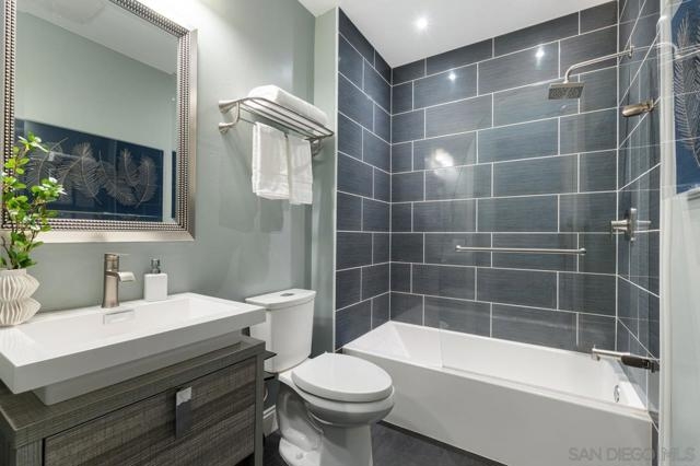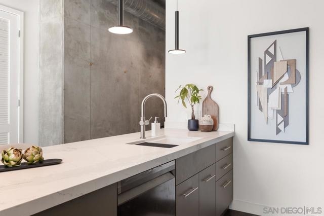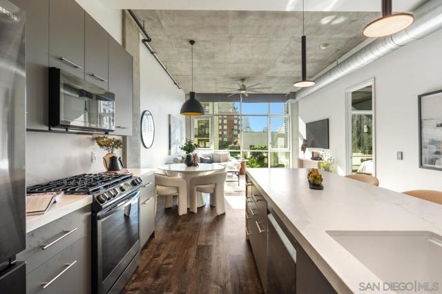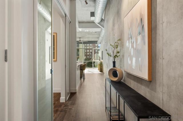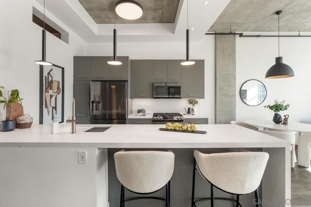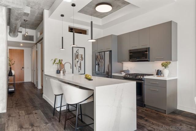 Step into a fully upgraded condominium in the heart of East Village. Designed by a principal of a respected interior design firm, this home has been thoughtfully updated with attention to detail. The open floor plan features recessed LED lighting and durable laminate flooring. At the center of the home, the kitchen is equipped with Euro-style cabinetry, Silestone countertops with a waterfall edge, and under-cabinet lighting for a clean, modern look with upgraded appliances. The bathrooms have been fully renovated with modern, high-end finishes. The primary features a glass tile shower surround with Silestone niche, ceiling rain head, hand shower, and frameless European glass door. New Euro-style vanity cabinets with Silestone countertops. The primary bedroom offers comfort with wall-to-wall carpeting and custom California closets for storage. Smart home features include remote-controlled electric shades, a Nest doorbell with camera, and SwitchBot remote access for the unit door. Building amenities include Amazon delivery lockers and Google Fiber Webpass with 1G internet—all included in the HOA fees. Nestled in the dynamic and walkable East Village neighborhood, this home blends luxury finishes with unbeatable access to San Diego’s top dining, shopping, and entertainment.