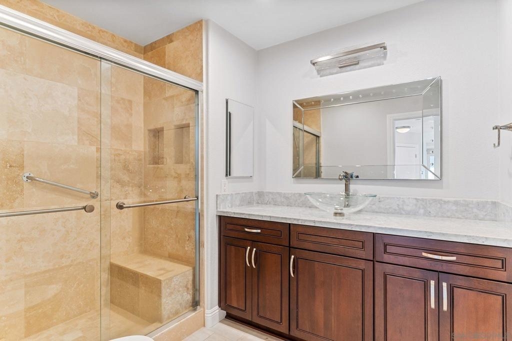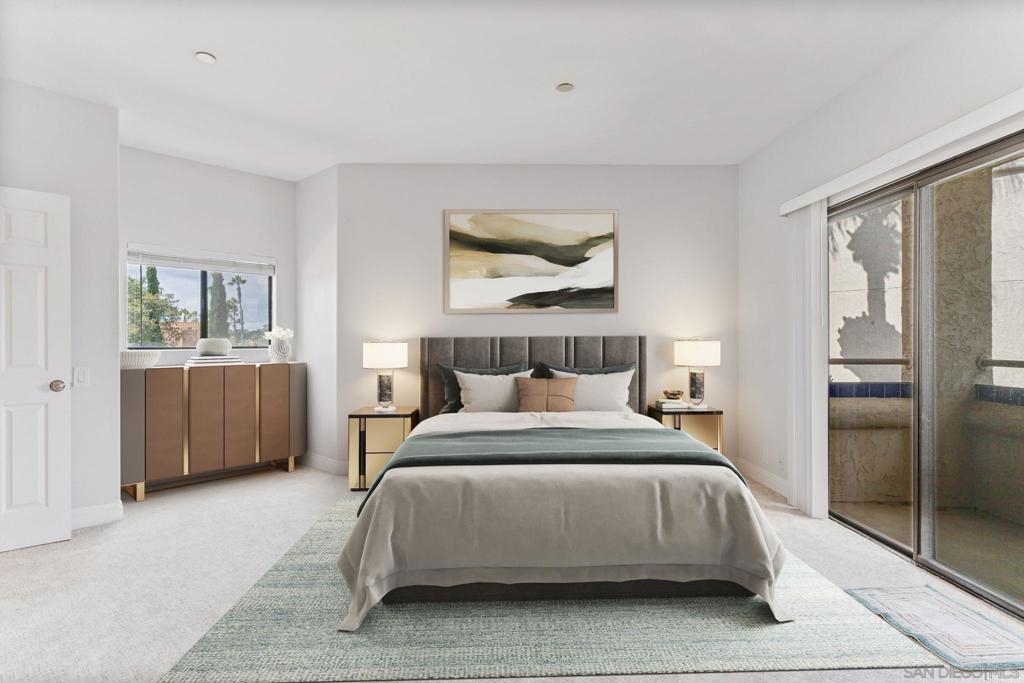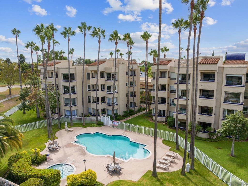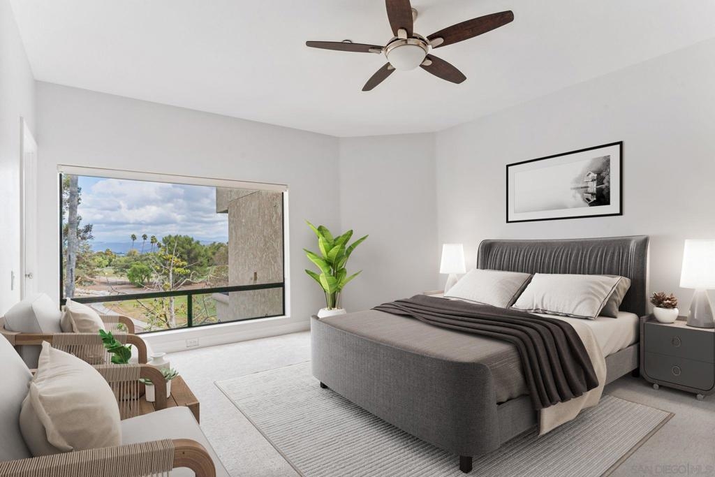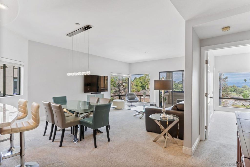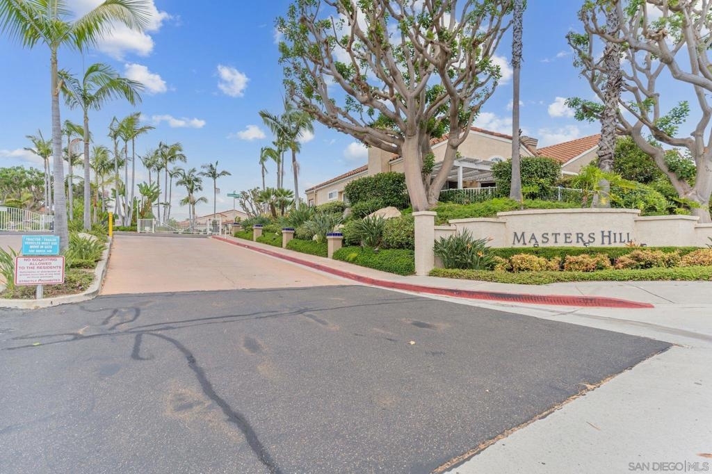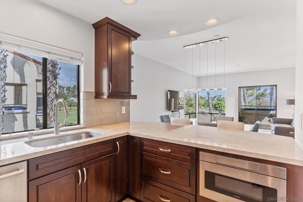 Welcome to the penthouse lifestyle in this beautifully upgraded 2-bedroom, 2-bath condo located on the top floor of the sought-after Masters Hill community in Rancho Bernardo. Boasting stunning views of the pool from both balconies as well as views of the adjacent golf course, this unit offers a light and bright open floor plan with upgraded finishes throughout, plus large walk-in closets in both bedrooms for ample storage. This elevator-served home includes two premier side-by-side garage parking spaces, each with convenient storage cabinets, and an oversized mailbox. This is a rare opportunity to enjoy resort-style living in one of Rancho Bernardo's finest communities with access to three on-site pools and tennis courts, plus included membership in the Community Association of Bernardo Heights. Walking distance to Bernardo Heights Middle and High Schools! The Community Association amenities include: Fitness center, 2 pools (25-yd main pool is heated at 82 degrees F), wading pool, jacuzzi), locker rooms, 3 tennis courts, 4 pickleball courts, 2 electric-gas grills, 2 basketball hoops, ping pong table, 2 pool tables and foosball. HOA also covers cable TV and internet, water, gas and trash (all utilities except electricity). Top quality unit with upgrades including: Completely renovated kitchen with custom soft close cabinets, French Door refrigerator and flexible single/double oven with 5 burner electric and griddle bridge both by Samsung, ultra quiet dishwasher by Bosch, Sharp under counter drawer microwave, high efficiency garbage disposal, quartzite counters, and under counter lighting with dimmer. All bathrooms are renovated with high-end fixtures, all new water valves, custom cabinets and marble counters. Living room upgrades include a built in for tech equipment with custom sliding doors. Newer furnace and thermostat, custom California Closet built-ins in primary bedroom closet, keyless front door entry, new Maytag washing machine, two assigned parking spaces on first level (spots #35 and #36)
