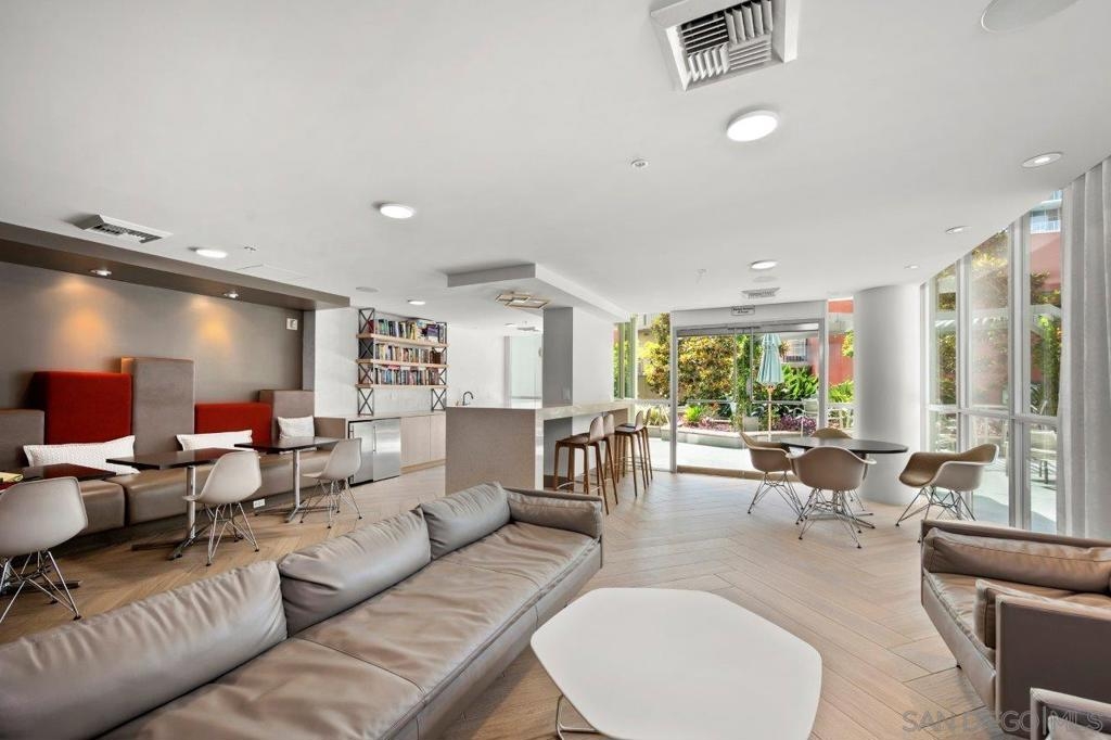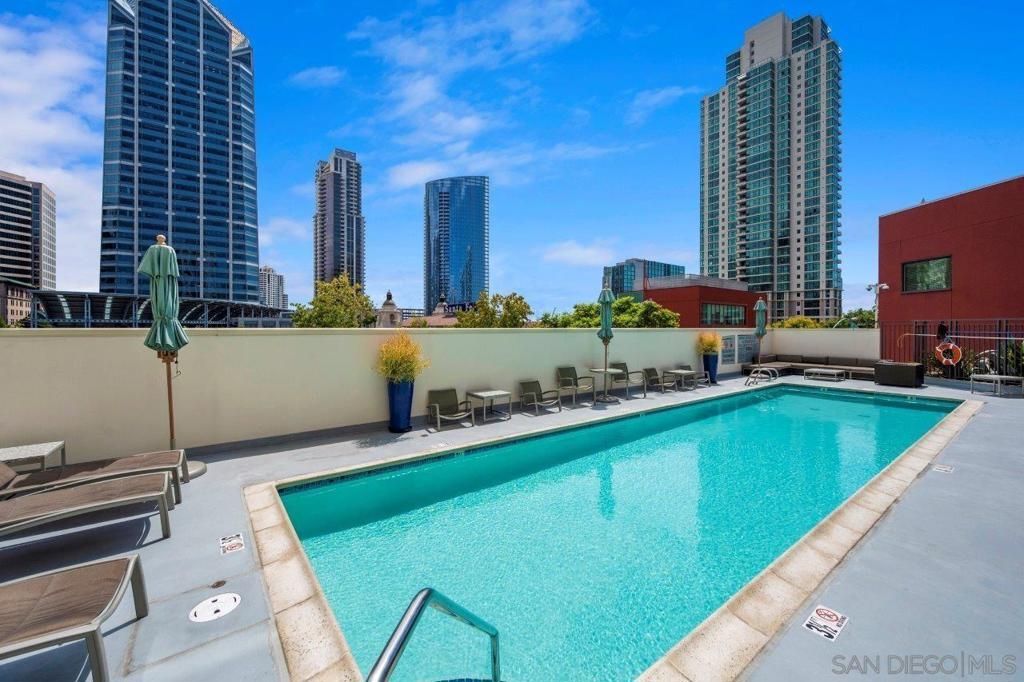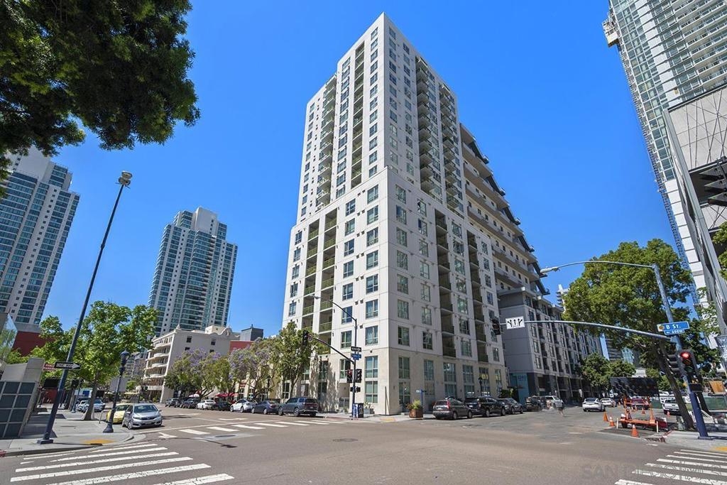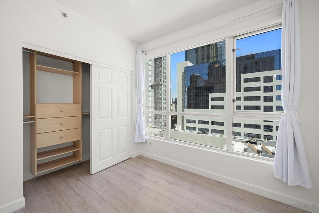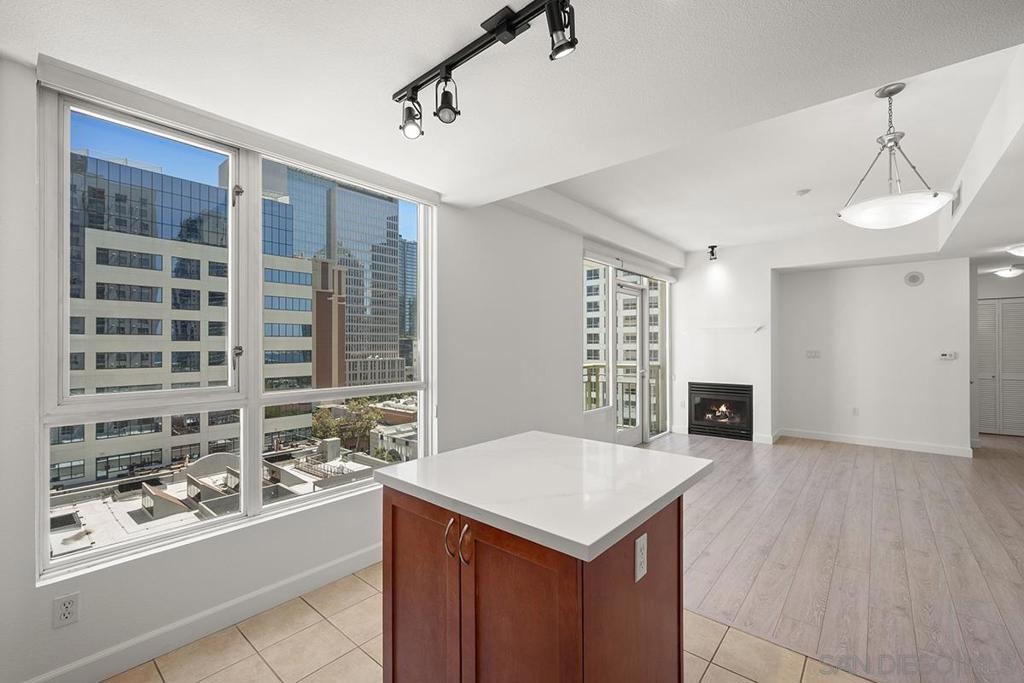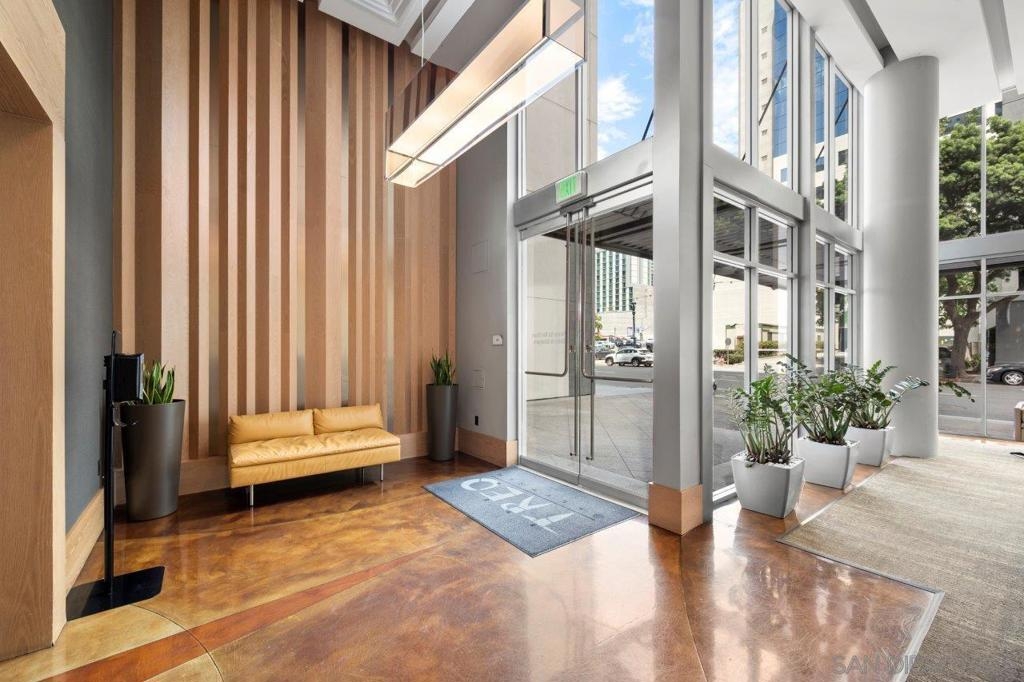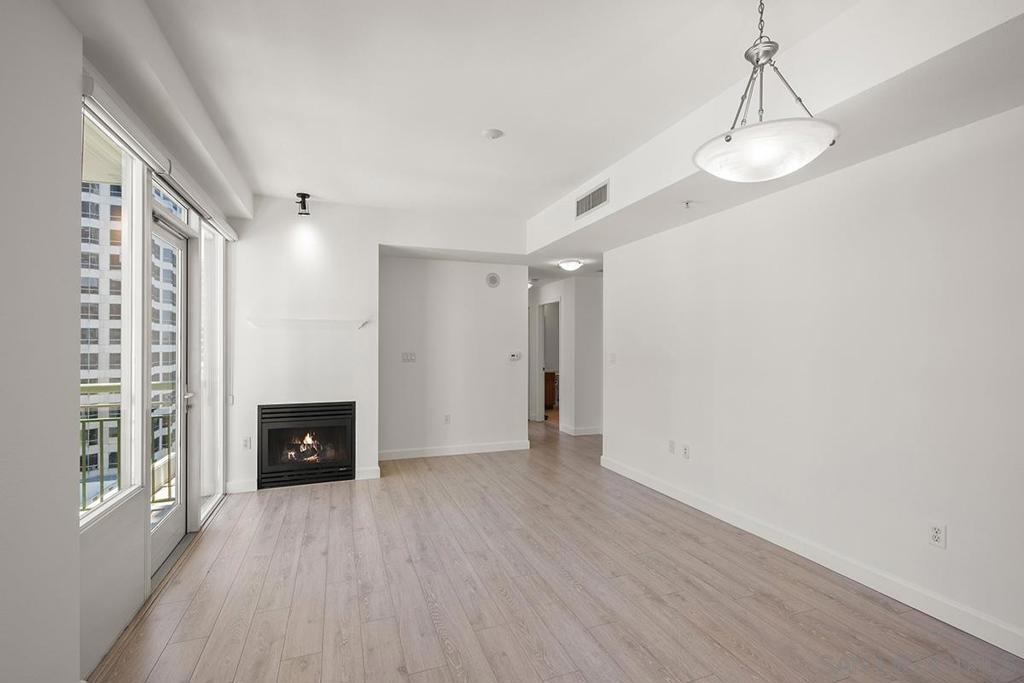 This 12th floor Treo residence offers Downtown San Diego skyline views from every room! Modern LVP flooring runs through the open living area and bedroom. Floor-to-ceiling windows flood the condo with natural light controlled by chic Hunter Douglas silhouette shades. The kitchen showcases warm wood cabinetry, quartz counters and center island, a full suite of upgraded stainless appliances with gas range, built-in microwave, and dishwasher - all under vivid lighting. The bedroom offers two closets, one with a custom organization system, plus a bathroom with a quartz vanity and combo shower/tub. Other features include a private balcony, fresh paint throughout, front-load washer and dryer, gas fireplace, RARE private storage in a temperature-controlled room, and a secured parking space on the first floor. Treo sits at the center of it all: walkable to the waterfront, Little Italy, the Gaslamp, and everything that makes downtown San Diego worth living in. Great building amenities including pool, hot tub, gym, BBQs, community rooms, and staffed lobby with LOW HOA dues. Long regarded as one of the best values in Downtown San Diego, the Treo HOA is exceptionally well managed, keeping dues low while maintaining a high level of building services and amenities. Enjoy a heated pool and spa, fitness center, multiple recreation and meeting rooms, barbecues and peaceful courtyard, plus security and concierge services. The lobby, hallways, and amenities have all been recently refreshed to foster a warm contemporary feel. Walk to the multitude of eateries and shops in Little Italy or Portside Pier, or take a slightly longer stroll to Seaport Village in the Marina District or the bustling Gaslamp Quarter. Treo is both FHA and VA approved.
