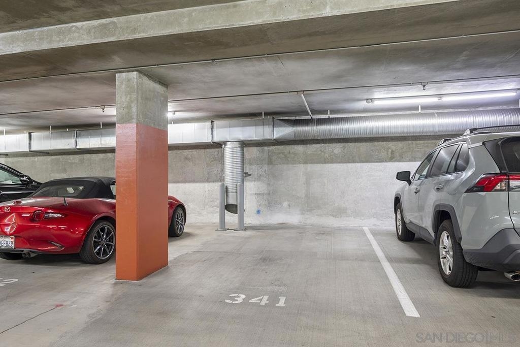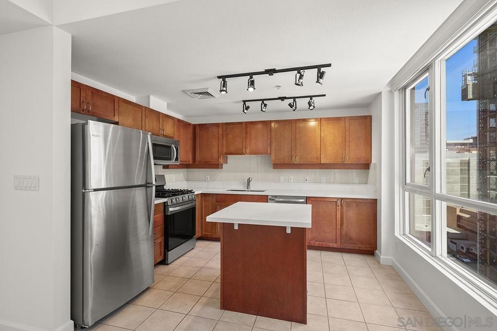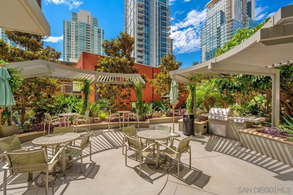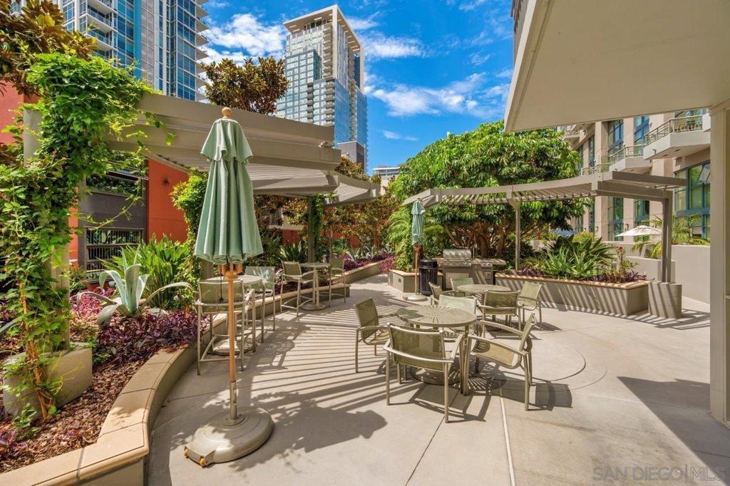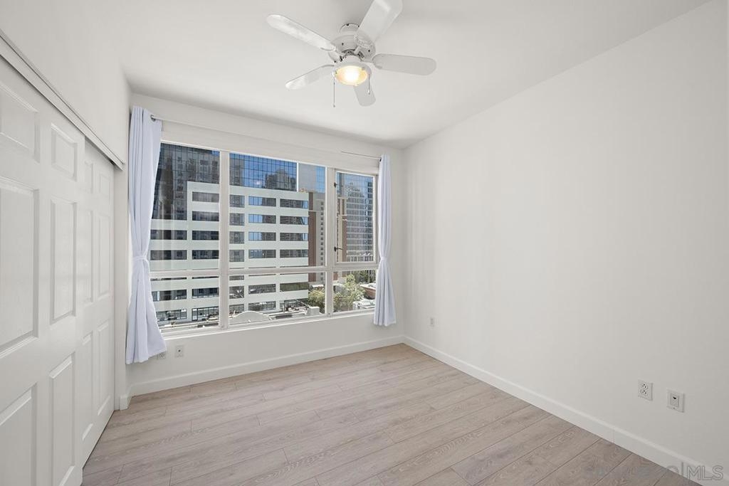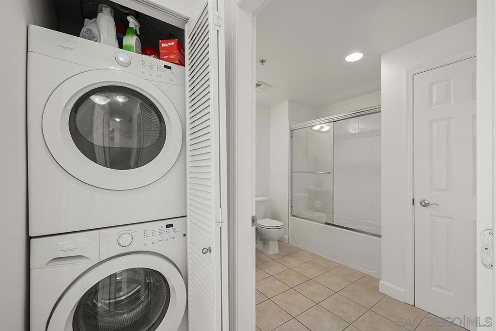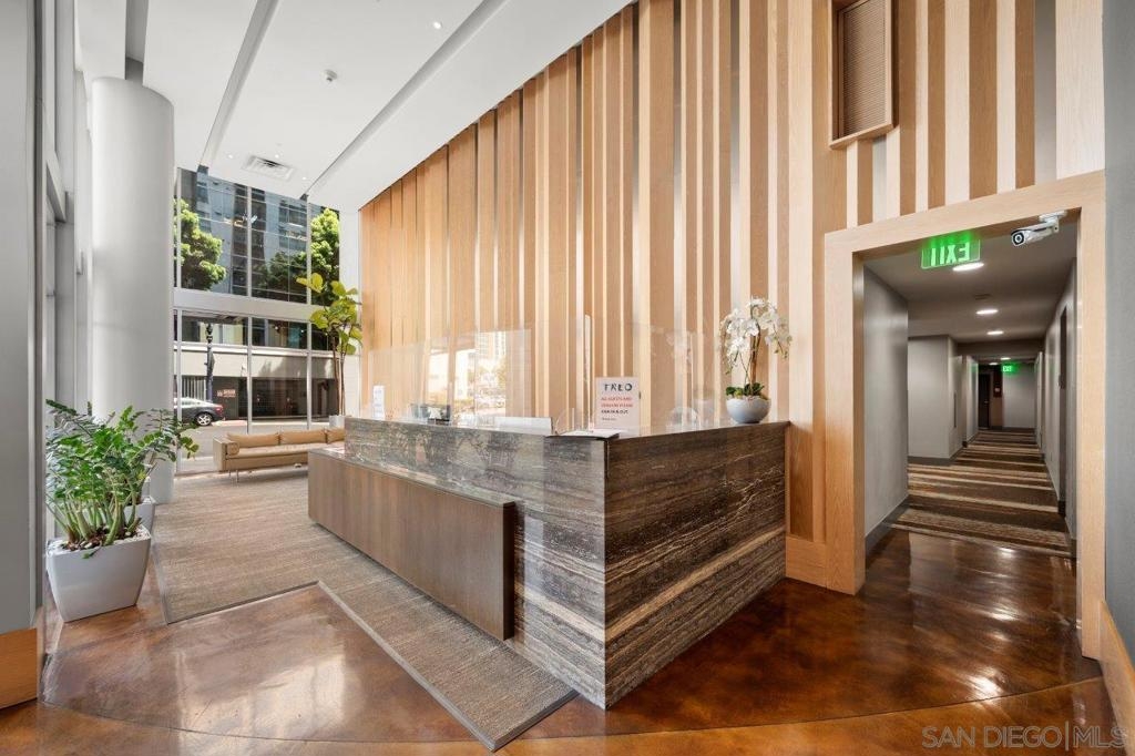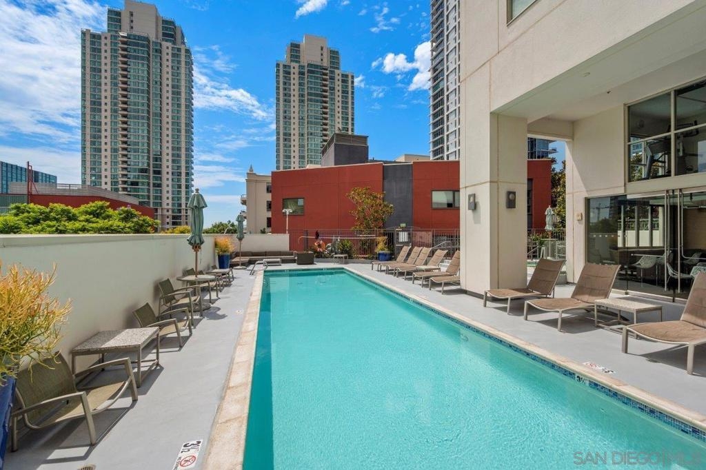 This 12th floor Treo residence offers Downtown San Diego skyline views from every room! Modern LVP flooring runs through the open living area and bedroom. Floor-to-ceiling windows flood the condo with natural light controlled by chic Hunter Douglas silhouette shades. The kitchen showcases warm wood cabinetry, quartz counters and center island, a full suite of upgraded stainless appliances with gas range, built-in microwave, and dishwasher - all under vivid lighting. The bedroom offers two closets, one with a custom organization system, plus a bathroom with a quartz vanity and combo shower/tub. Other features include a private balcony, fresh paint throughout, front-load washer and dryer, gas fireplace, RARE private storage in a temperature-controlled room, and a secured parking space on the first floor. Treo sits at the center of it all: walkable to the waterfront, Little Italy, the Gaslamp, and everything that makes downtown San Diego worth living in. Great building amenities including pool, hot tub, gym, BBQs, community rooms, and staffed lobby with LOW HOA dues. Long regarded as one of the best values in Downtown San Diego, the Treo HOA is exceptionally well managed, keeping dues low while maintaining a high level of building services and amenities. Enjoy a heated pool and spa, fitness center, multiple recreation and meeting rooms, barbecues and peaceful courtyard, plus security and concierge services. The lobby, hallways, and amenities have all been recently refreshed to foster a warm contemporary feel. Walk to the multitude of eateries and shops in Little Italy or Portside Pier, or take a slightly longer stroll to Seaport Village in the Marina District or the bustling Gaslamp Quarter. Treo is both FHA and VA approved.
