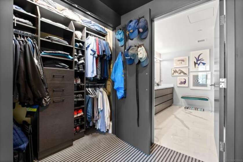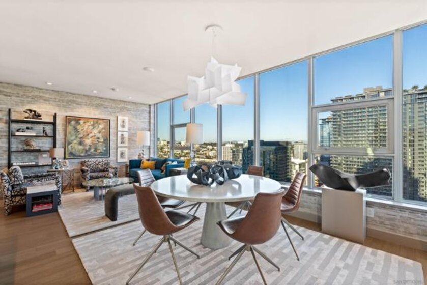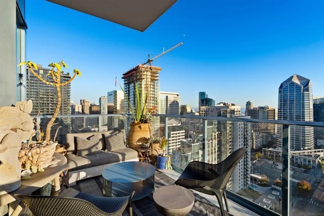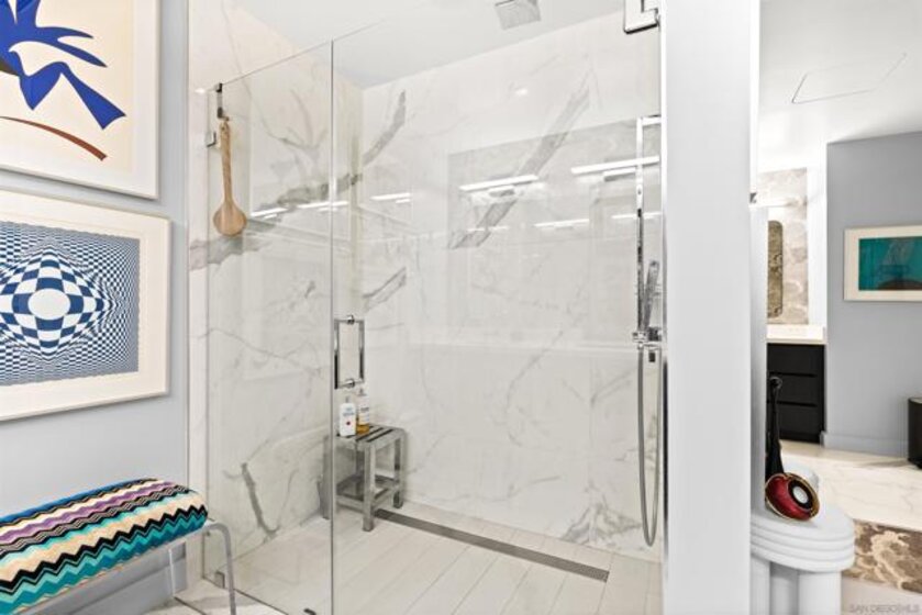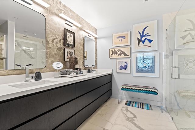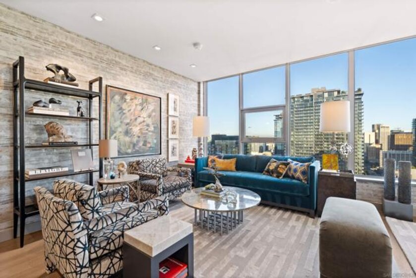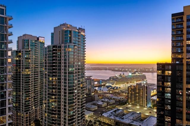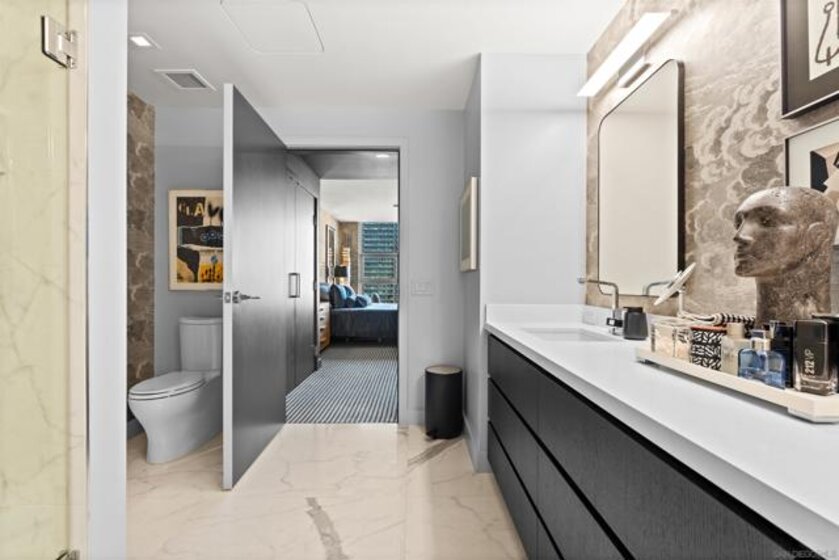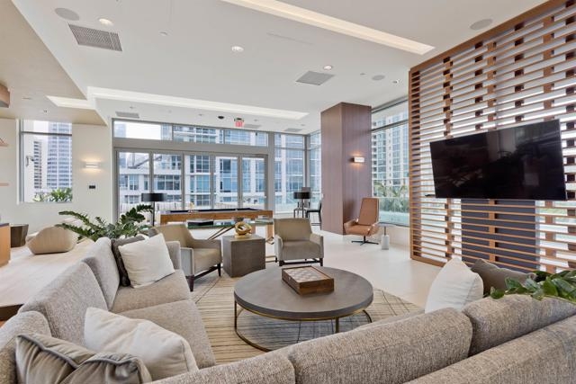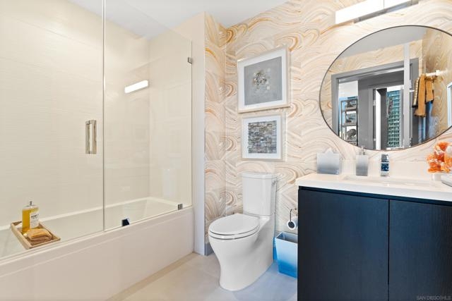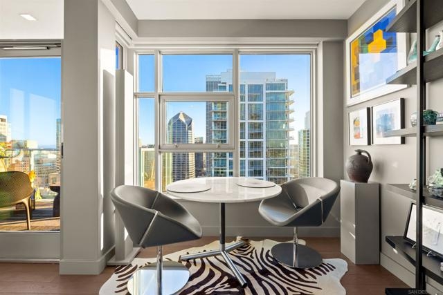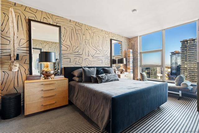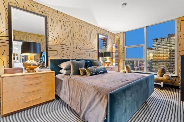 Welcome to Savina Residence 2705, a high-floor southeast corner home boasting sweeping views of the city skyline, bay, Coronado, and Point Loma. This spacious two-bedroom plus den, two-bath residence offers an open layout filled with natural light, thanks to expansive windows that perfectly frame the surrounding vistas. The kitchen is thoughtfully designed with high-end finishes and features an adjacent nook that functions beautifully as a home office or can be customized for additional storage. Notable upgrades include designer wallpaper—Cole & Son’s Nuvole from the Fornasetti Senza Tempo Collection and Kelly Wearstler’s Graffito—as well as 100% wool carpeting by J. Mish in the bedrooms and motorized Lutron shades throughout. Savina is downtown San Diego’s newest luxury residential tower, located at the edge of Little Italy and the Columbia District. The building offers a comprehensive suite of resort style amenities including 24 hour concierge, EV charging, a pool and spa, state of the art fitness center, yoga terrace, social lounge, business center, pet retreat and grooming areas, steam and sauna rooms, bike tuning room, and indoor outdoor gathering spaces. Just steps from the waterfront and some of San Diego’s best dining and entertainment, Savina delivers a refined lifestyle in the heart of the city.