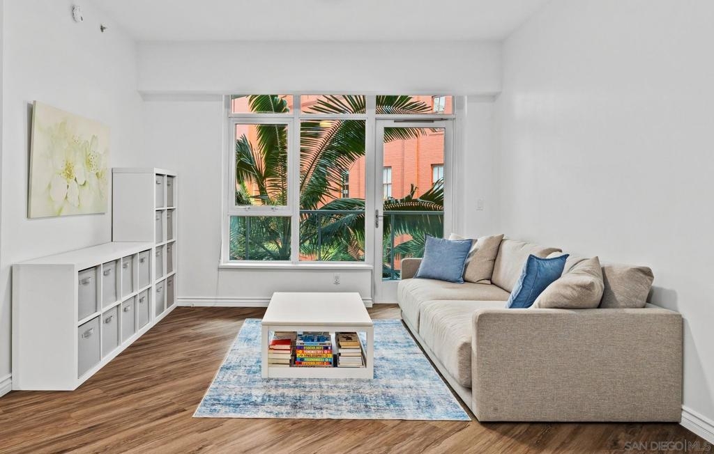 Welcome to Breeza, one of the most desirable residences in the Downtown's Little Italy neighborhood. This is one of only six oversized one-bedroom homes in the entire community—making it a truly rare opportunity and arguably one of the finest one-bedroom residences in the neighborhood. This beautifully maintained home showcases pride of ownership throughout and features a bright open-concept floor plan designed for comfortable living and effortless entertaining. The chef-inspired kitchen is centered around a large granite island with breakfast bar, complemented by stainless steel appliances, abundant cabinetry, and generous counter space. Soaring 10-foot ceilings in both the living room and bedroom enhance the sense of space, while beautiful wood flooring and large windows create a light and inviting atmosphere. The spacious bedroom offers direct access to the well-appointed bathroom with dual vanities, creating a convenient and functional layout. Step outside to your private oversized balcony, perfectly positioned among mature whispering palms overlooking Breeza’s award-winning courtyard—providing a peaceful and private retreat rarely found in urban living. Additional highlights include P-1 parking, new plumbing hardware, new washer and dryer, and updated lighting. Ideally located at the southwest edge of Little Italy and just one block from the waterfront, this home offers one of downtown San Diego’s most walkable lifestyles, moments from the scenic San Diego Bay and the beautiful Waterfront Park. Residents of Breeza enjoy a welcoming community atmosphere and resort-style amenities, including a heated pool and spa, fully equipped fitness center, community lounge, business center, Wi-Fi in common areas, on-site professional management, and a spectacular 8th-floor rooftop terrace with unobstructed views of the bay, sunsets, the historic Star of India, and the downtown skyline. Just steps from Little Italy’s celebrated restaurants, cafés, and the renowned weekly farmers market, and moments from Waterfront Park featuring playgrounds, open green space, pickleball and basketball courts, and a dog park. A rare and exceptional opportunity in one of downtown San Diego’s most sought-after communities—priced to sell.