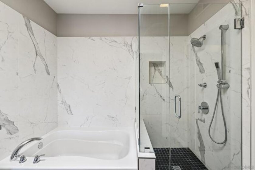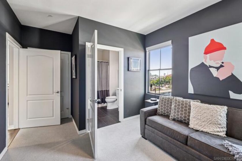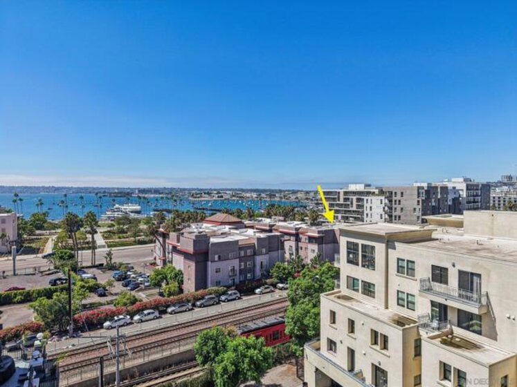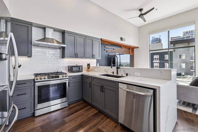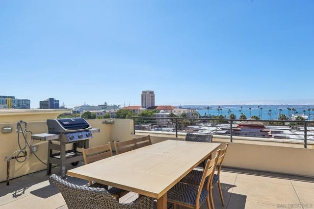 Experience breathtaking city and bay views from the top-floor, corner penthouse in DOMA—right in the heart of Little Italy. Rarely available and single-level, this 2 bedroom / 2.5 bathroom, 1,375 SF residence pairs dramatic high ceilings and an open, airy floor plan with wall-to-wall urban energy and sparkling water vistas from the living room and both bedrooms. A spacious private balcony —perfect for grilling and sunset watching— extends your living space outdoors. Two reserved, side-by-side parking spaces are conveniently located near the elevator for effortless city living. Inside, thoughtful upgrades elevate everyday life: luxury vinyl plank floors, new carpet, fresh paint, and a reimagined chef’s kitchen with quartz counters, new cabinetry, sink, and backsplash, plus a suite of newer smart appliances (cooktop and fridge). The living area features custom wood paneling by a local artist, while electric smart shades in the living room and bedroom dial in light and privacy with a tap. Both bathrooms showcase new tiling; the primary suite shines with a fully redone bath (new shower, dual sinks, lighting, cabinetry, and quartz backdrop) and a custom built-in closet. Ample cabinetry maximizes storage throughout and a spacious in-unit laundry room adds everyday convenience. Step outside your door to Little Italy’s restaurants, cafés, and weekend mercato—or head upstairs to DOMA’s rooftop deck for sunsets and the fitness room for on-site wellness. This is the one you’ve been waiting for!