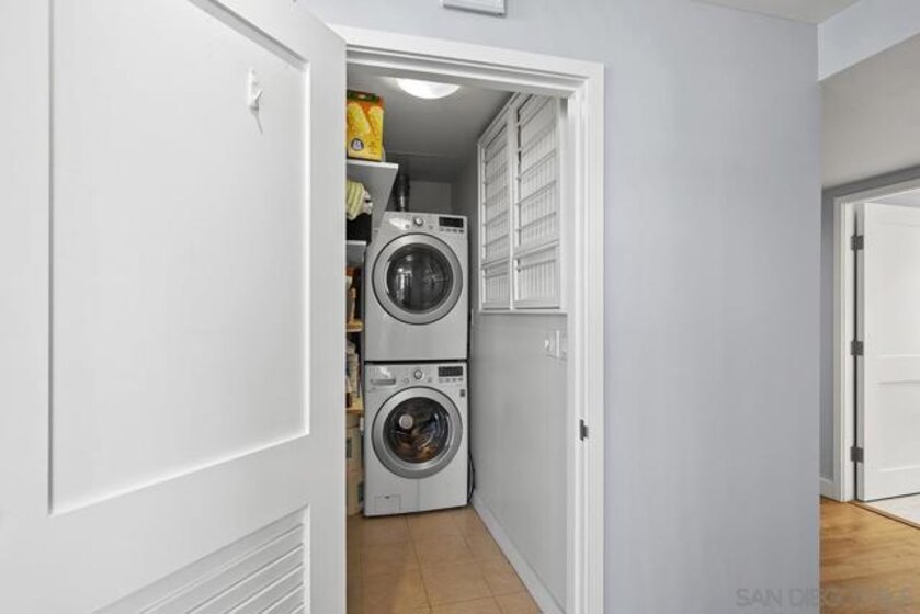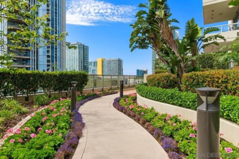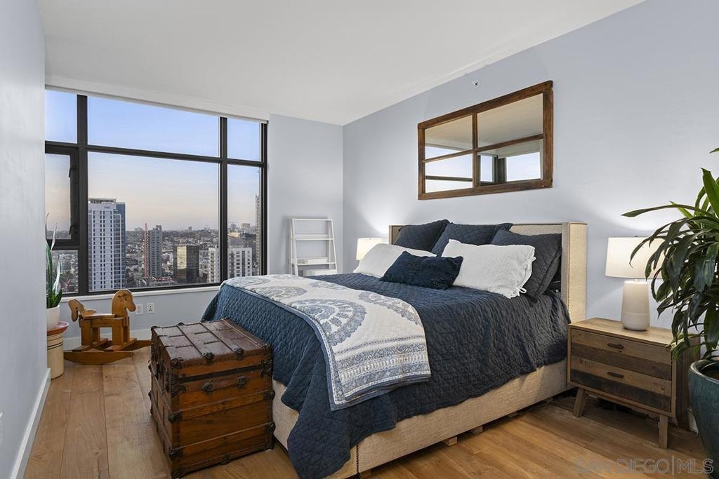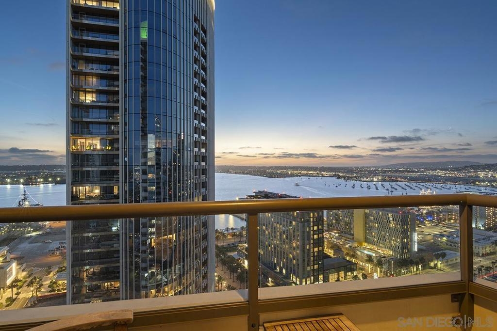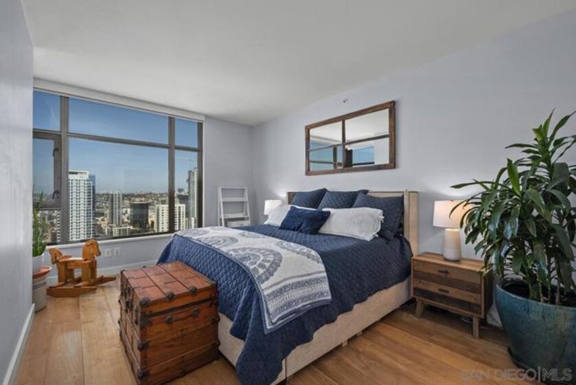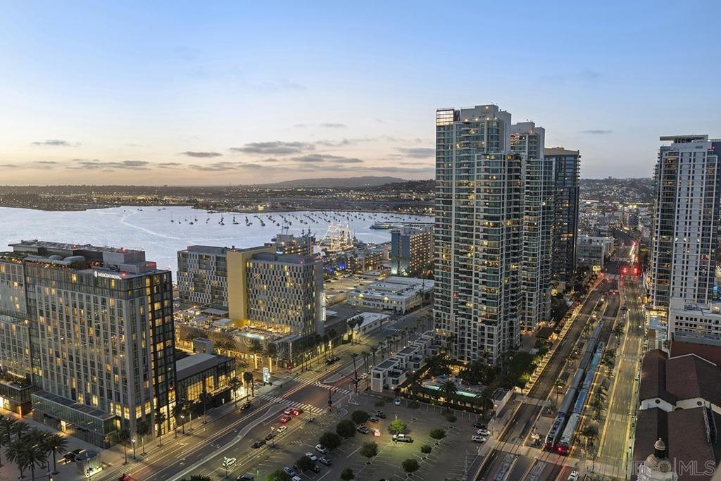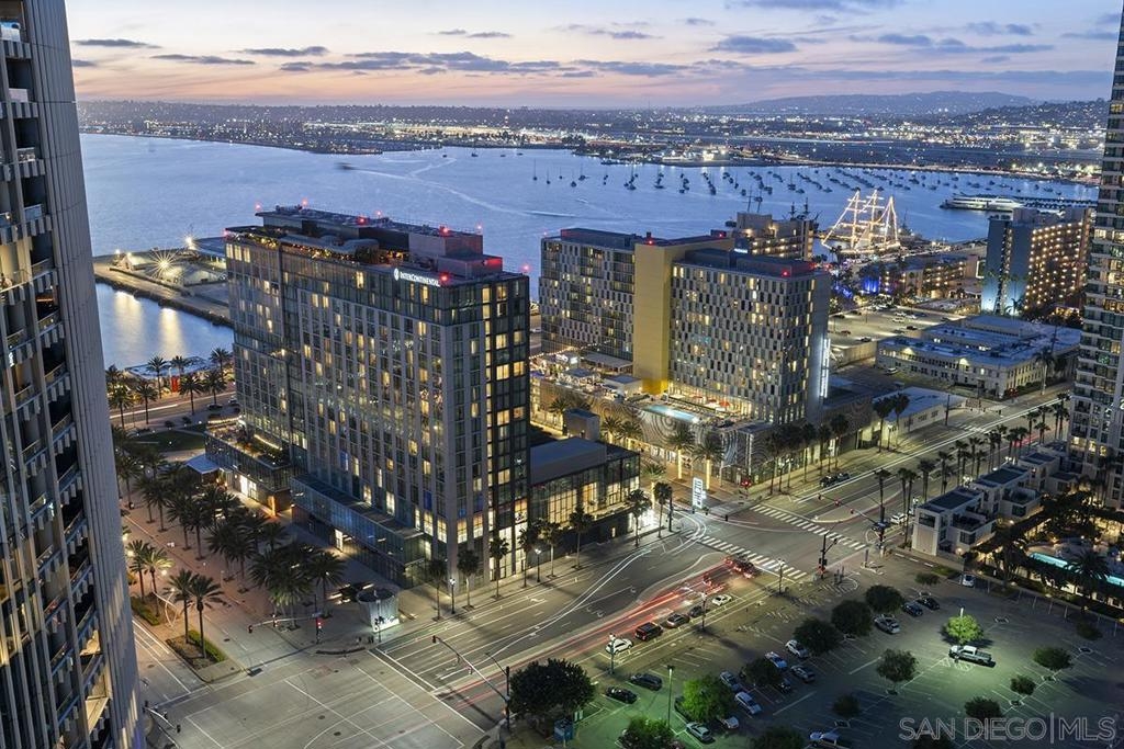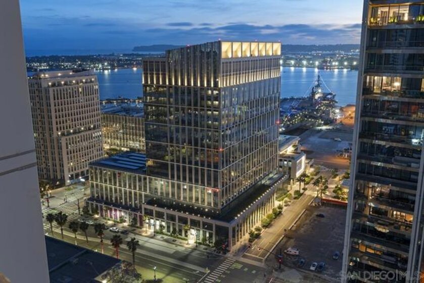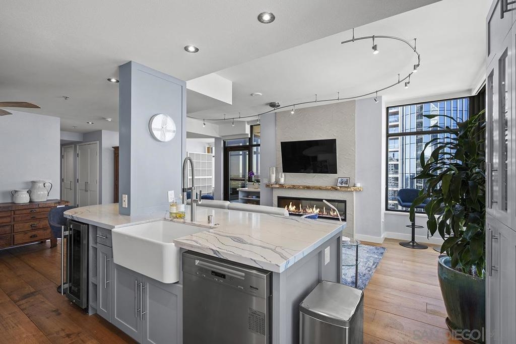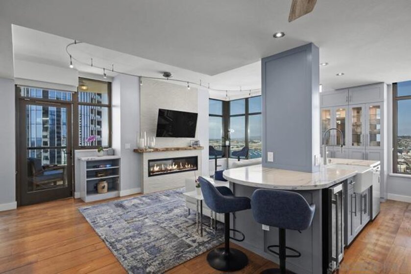 Come experience true high-rise living in one of only two residences with this coveted floor plan at Electra. Perched on the 29th floor, this fully reimagined northwest corner home captures sweeping views of the bay, Point Loma, and the sparkling city skyline from every room. A private balcony sets the stage for unforgettable San Diego sunsets. Thoughtfully redesigned for both style and function, the residence showcases wide-plank reclaimed teak flooring, a sleek linear fireplace with stone surround, and a striking petrified wood mantel. The open-concept kitchen is a true standout created for those who love to cook and features a Wolf range, built-in Sub-Zero refrigerator, Miele dishwasher, beverage chiller, quartz countertops, farmhouse sink, subway tile backsplash, and a custom glass-front display cabinet. Wake up to blue water views in the serene primary suite, complete with a spa-inspired ensuite bath offering dual vanities, a modern LED mirror, and a step-in shower. The versatile second bedroom, currently styled as a den/office, retains its closet and can easily be converted back to a full bedroom. The guest bath has also been tastefully upgraded with quartz surfaces and new cabinetry. Additional highlights include side-by-side parking on P1 with EV charging and dedicated storage on the same level. Ideally located in the vibrant Columbia District, you’re just moments from Waterfront Park, Little Italy, and Seaport Village. Rarely does a home combine this level of design, location, and view come along often so don’t miss your opportunity. Offering a fabulous location in the coveted Columbia District, you will love being only a short walk to Waterfront Park, Seaport Village, The Headquarters, and the brand-new Rady’s Shell at Jacobs Park, a unique live music venue and home of the San Diego Symphony! Also enjoy proximity to the future life science and biotechnology research development The Research and Development District (The RaDD) at the Embarcadero and the sustainable tech-focused Horton Plaza Redevelopment in the center of the city. Electra has the unique distinction of being built around the historical 1928 SDG&E Station B. Residents can take advantage of an array of services including a concierge, security, and guest parking spaces available by reservation through a simple mobile app. Unwind and relax in the steam room or sauna, resort-style pool and spa, fitness center, and Electra Park on the 5th floor surrounded by lush landscaping and a romantic outdoor fireplace and top-of-the-line barbecues.